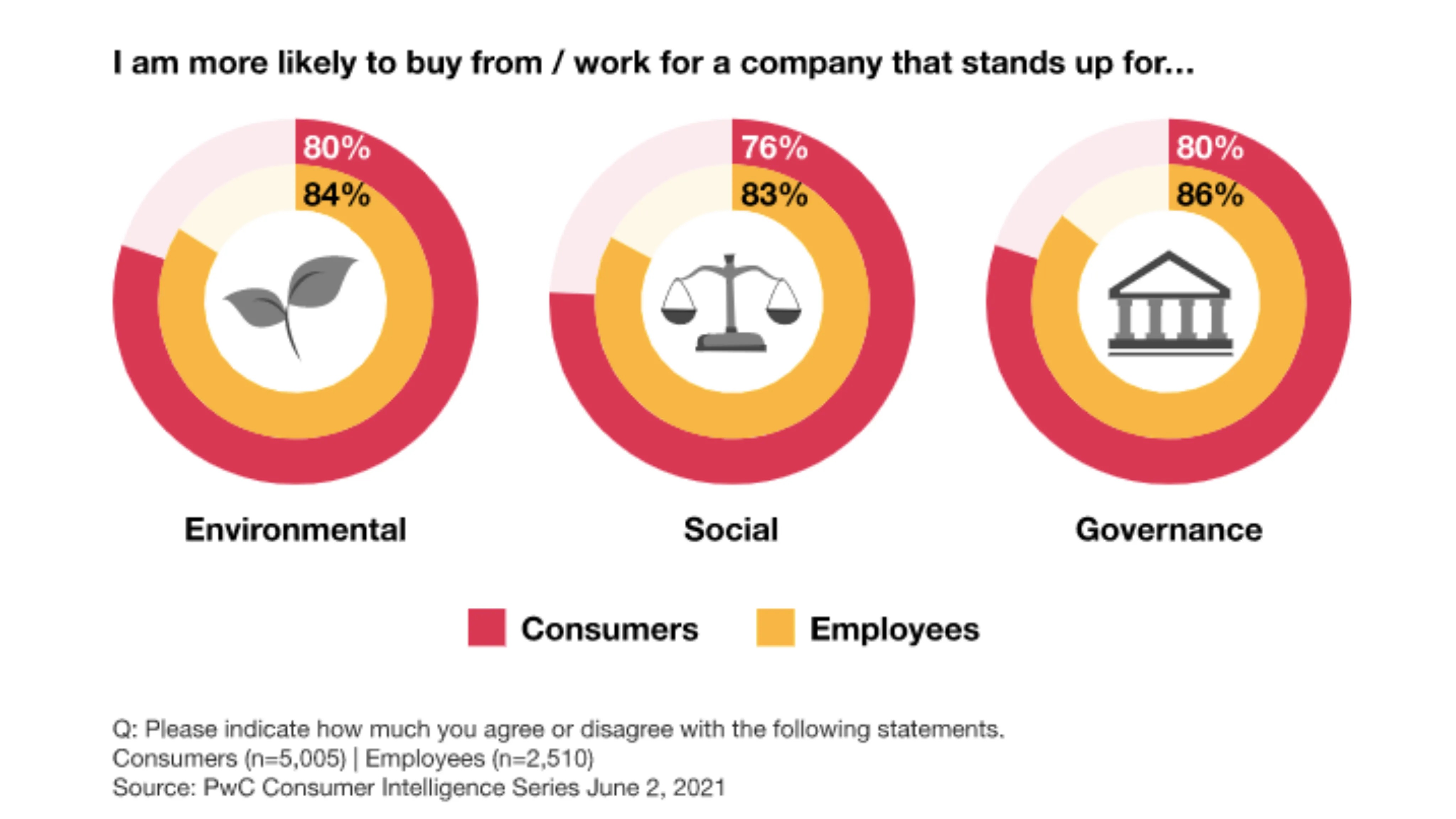 Shareholders, employees and end customers have become more aware and conscious of the ESG impact of the employers they work for, their investment decisions and consumption choices. PwC’s 2021 ESG Consumer Intelligence Survey found that over 80% of consumers and employees are more likely to give their custom or their labour to organisations who take a stand on ESG factors.